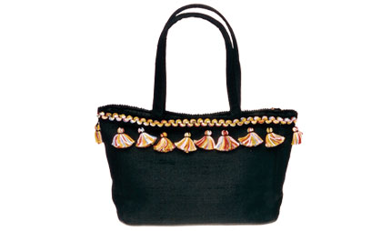 Black Gaucho Collection Rich black microfiber suede flip flop and black raw silk handbag, both with multi-color trim and handmade tassels. $100 (save 5% when ordering the set) $100.00(5% off of $106.00)